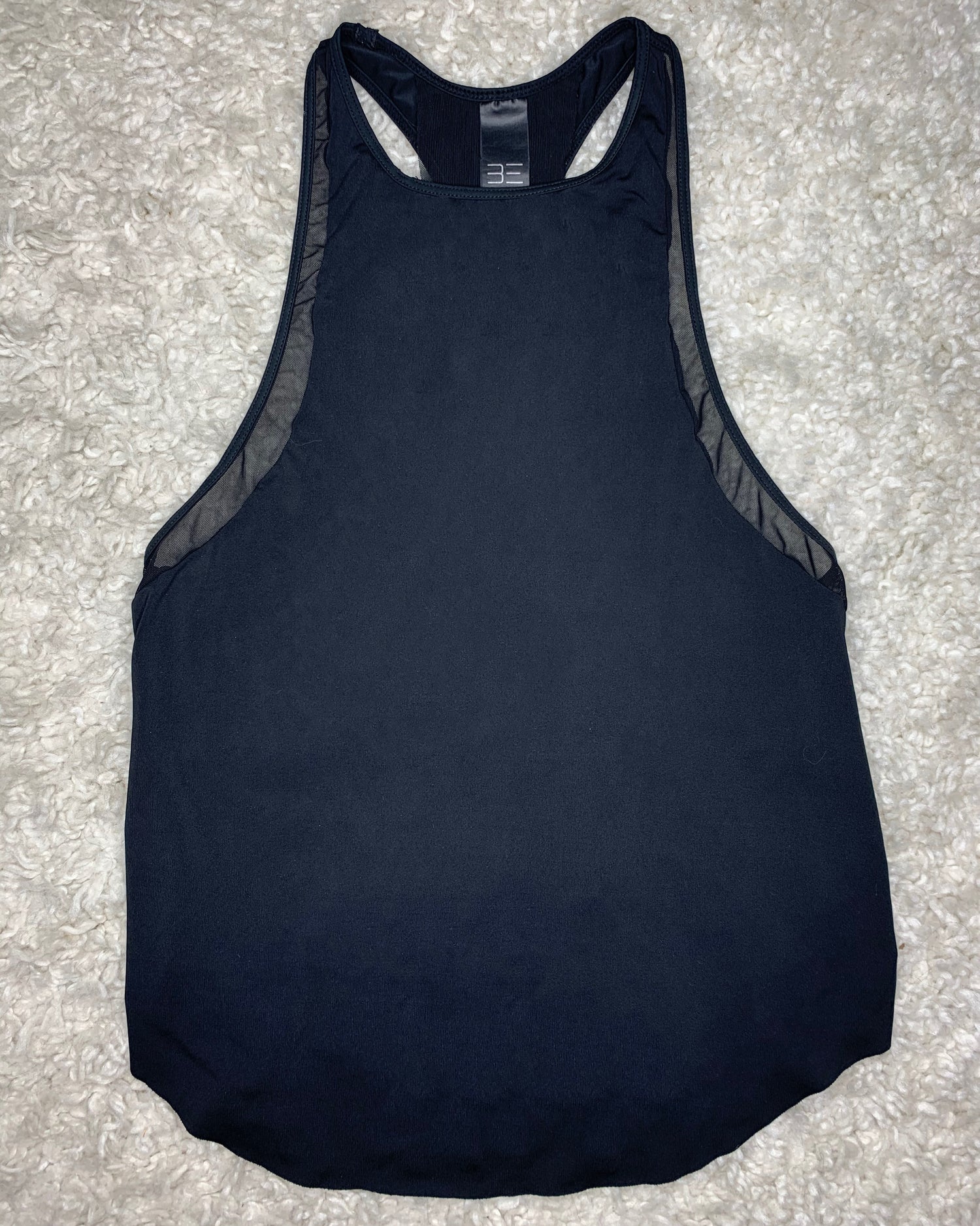 A high neck tank with ventilating mesh inserts on the sides and back. Cool-feel fabric for freshness.